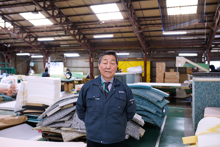 国内でシェア約40%を占める発泡品事業を展開し、世界でもトップレベルの発泡技術を持っています。硬さ、伸び、引っ張り、反発弾性など、密度によって何十種類ものウレタンがあり、それらを組み合わせて快適な座り心地を実現しています。ウレタンはポリオールとイソシアネートを主原料とし、混ぜ合わせて発泡させ、その際、原料の量を気温や湿度に合わせて調整し、均一に発泡させることが重要です。ウレタンの発泡作業は、混ぜ合わせから発泡まで、繊細で微妙な作業が必要になります。