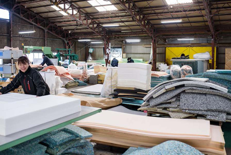 心石工芸との最初の取引は、もう20年も前のことです。初めての注文は、ソファの後ろに置く丸いクッションのウレタンでした。「膨らみをもっと出してほしい」「端面はR型にしてほしい」と、先代の心石会長の厳しい要求をなんとかクリアして、20個分を納品したのが初めての取引でした。 長年使ってもヘタリのない耐久性のあるソファには、密度の高いずっしりと重たいウレタン が必要不可欠です。しかし、ウレタンは体積が大きいため、特に長距離の輸送では運賃がかさみ採算性が悪くなります。心石工芸にとって、品質の高いウレタン工場が近所にあるのは、とてもありがたかったと聞いています。