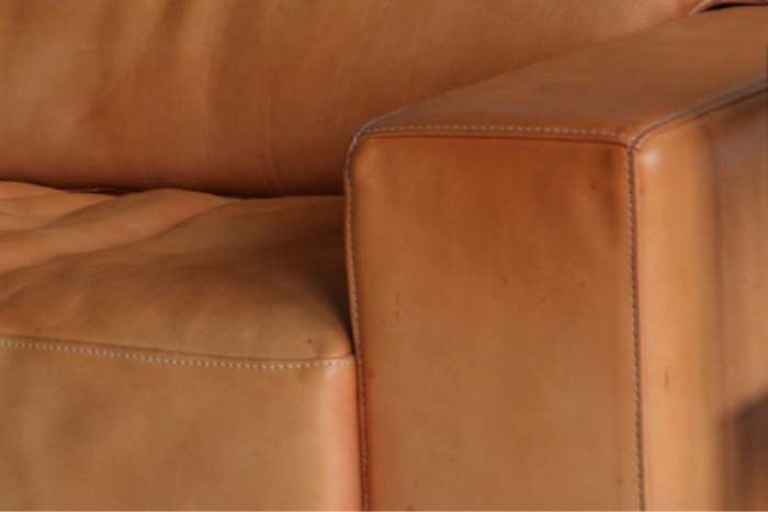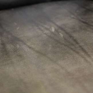 革には、タンニンなめしとクロムなめしの2つの方法があります。この仕上げに使われた革は、タンニンなめしです。タンニンなめしの革は、植物性タンニン(茶渋や柿渋など)を使い、革を丈夫にする方法です。最初は白っぽい肌色の革ですが、タンニンが酸化することで徐々に色が濃くなっていきます。クロムなめしは、柔軟なのに強い革になり、一般的なソファによく使われますが、ブルーグレー色に仕上がるため、素上げで使われることは、まずありません。