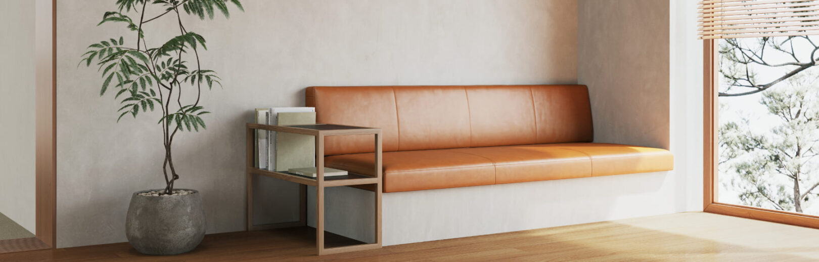 木枠~仕上げの張りまで、自社工場で一貫して行うからそこできる柔軟サイズオーダー。空間にあわせたオーダーが可能です。 これまで多くご相談を頂いた造作ソファを、より手軽にお選び頂けるよう、1つのモデルとして "CEDES" を設計しました。