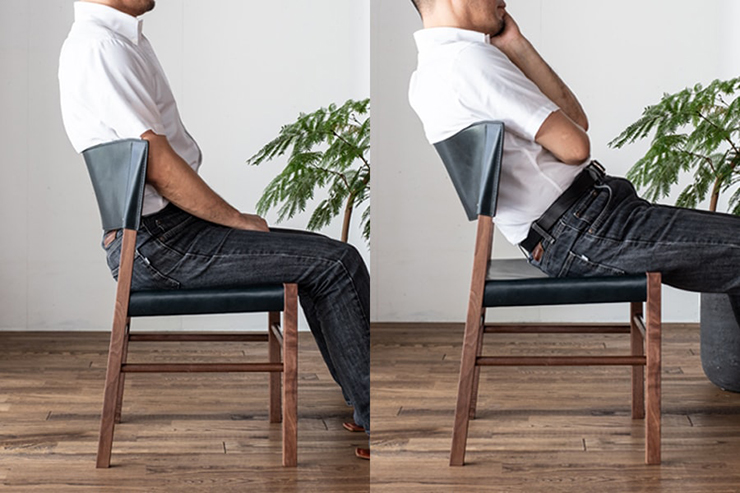 厚革で作られた帯状の背もたれは、人の形や角度に合わせてフィットします。