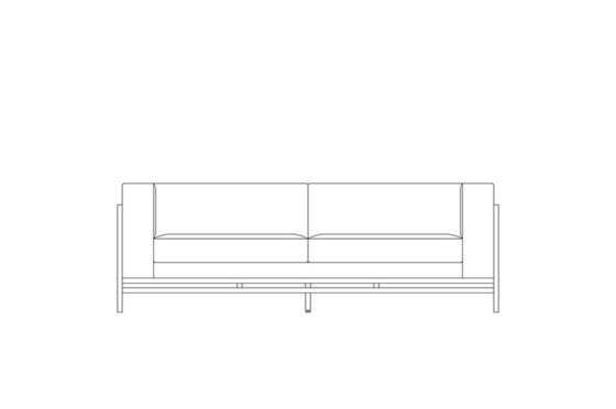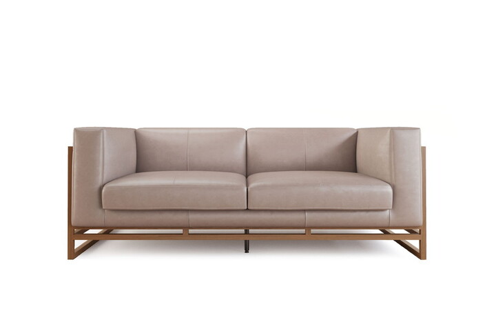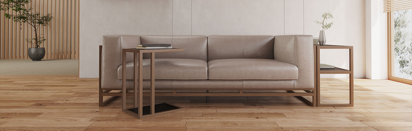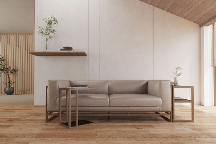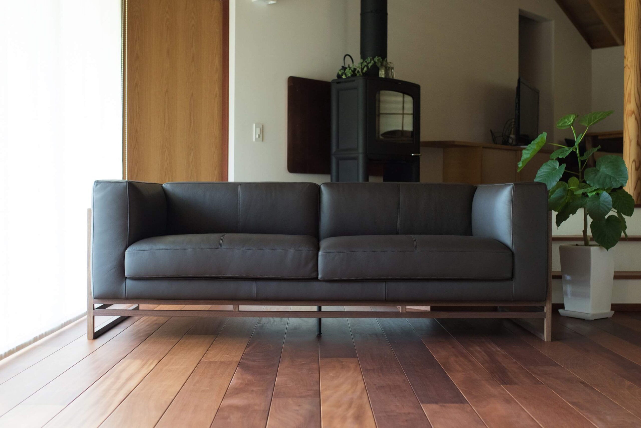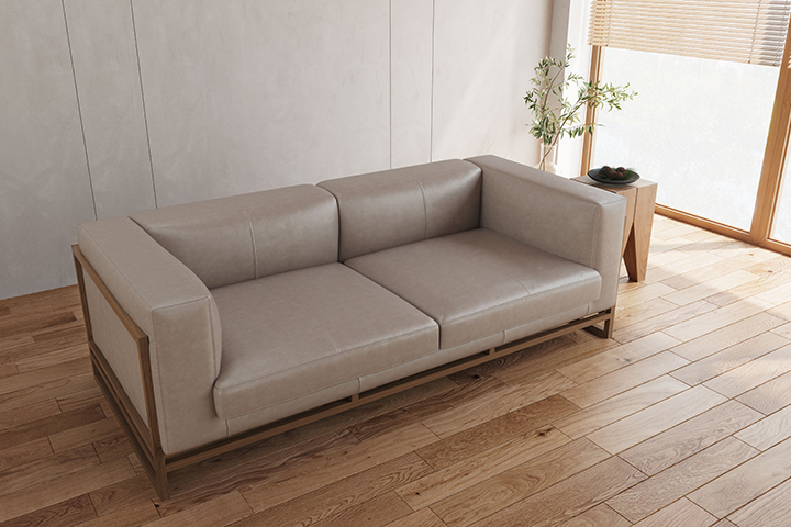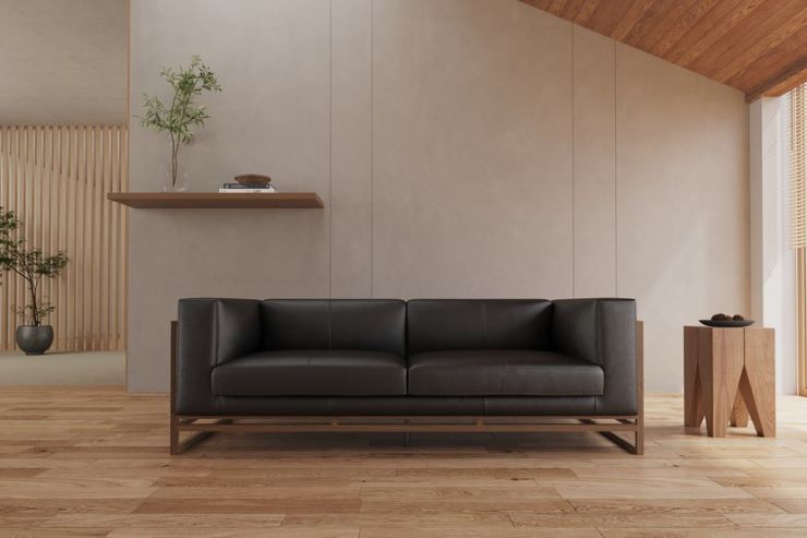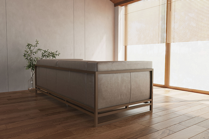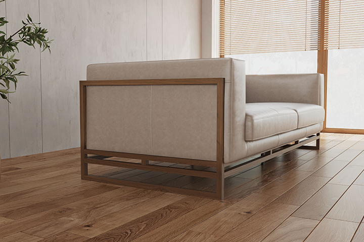 細いフレームと広く開いた脚元が、ソファを軽やかに見せます。