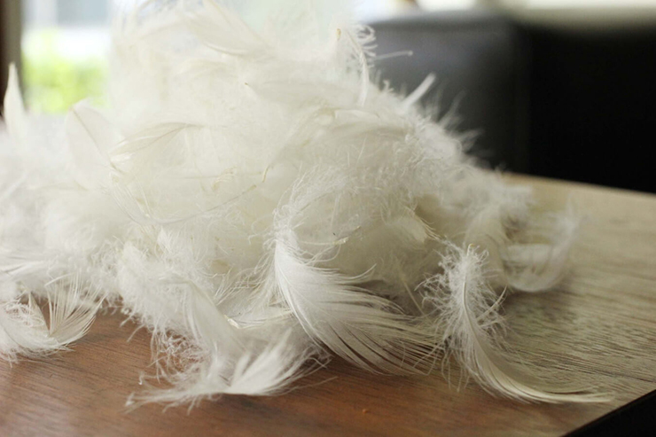 クッションの中材はスモールフェザー100%です。じんわり沈み込むクッション性です。クッションのボリュームが少なくなったら、パンパンと叩くように空気を入れてください。そうすれば、元通りのボリュームになります。