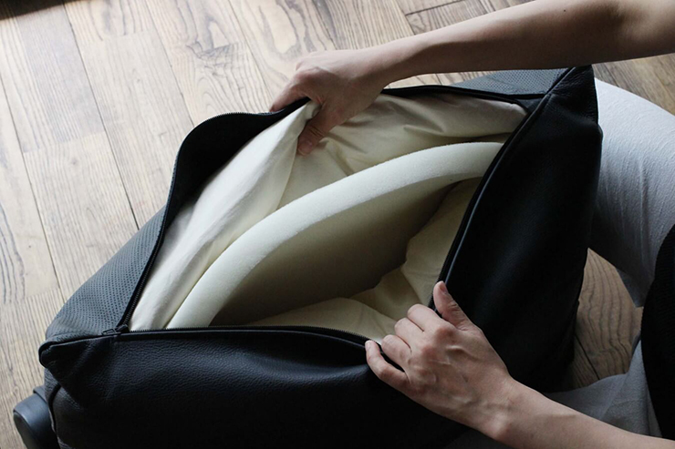 クッションにボルスターが付いていると、低い背もたれにボルスターを置くことで、背中の上部まで包み込んでくれます。こちらのタイプのみ、一部ウレタンが入っています。