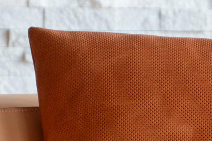 クッション性を出すために裏面は空気抜きの仕様になっています。小さな穴が複数開いている革を使用します。空気が裏面全体から抜けることで、ちょうど良いクッション性を出すことができます。布張りでは穴はありません。
